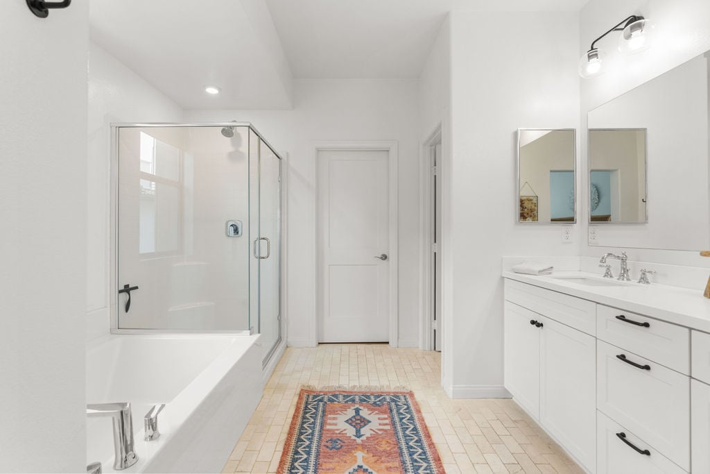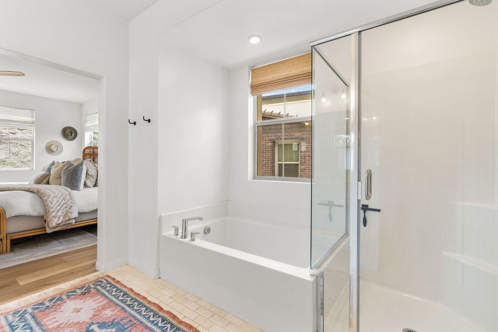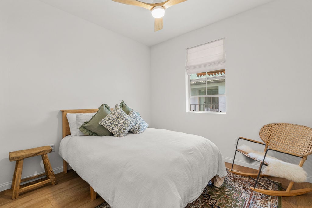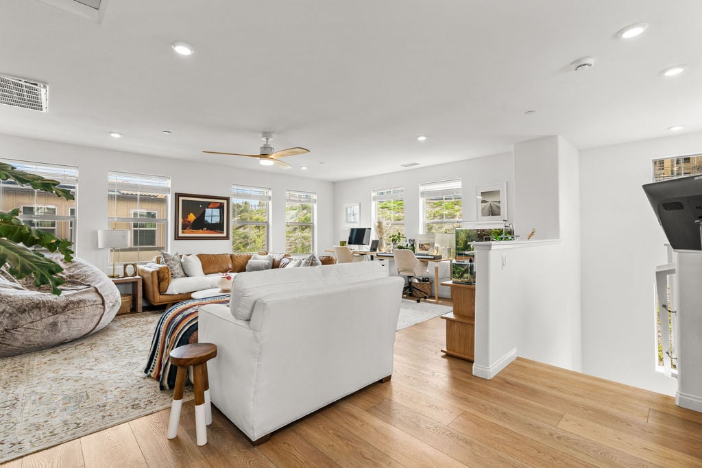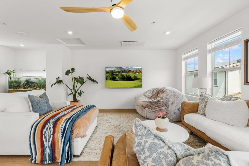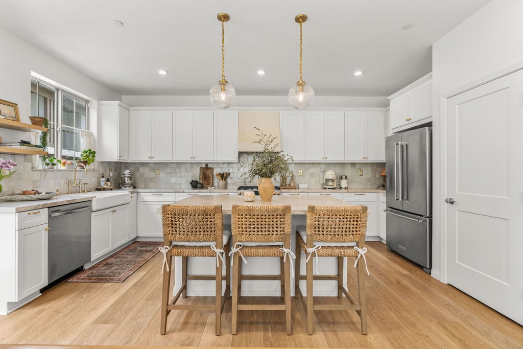 BE PREPARED TO FALL IN LOVE! Welcome to 1763 Laurelwood Way, a stunning end-unit townhome in the highly sought-after Melrose Heights community. Built in 2024 and offering nearly 2,200 sq. ft., this 3-bedroom, 2.5-bath residence showcases extensive upgrades and thoughtful design that will impress even the most discerning buyer. Enjoy lower electric bills with owned SOLAR, A/C, ceiling fans, soaring 9-foot ceilings and custom window treatments. The home also features white oak luxury vinyl plank flooring—no carpet anywhere. The professionally landscaped wraparound patio is a true space of zen; complete with fountain, lush greenery and a smart irrigation system. Inside, the open-concept great room is filled with natural light. The living, dining, and kitchen spaces flow seamlessly, creating an inviting and functional layout. The kitchen is a true showstopper. Featuring leather finished Taj Mahal quartzite, a large island, Zellige tile backsplash, Venetian plaster hood, Perrin & Rowe faucet w/farmhouse sink, Café range, pendant lighting, and elegant English satin gold finishes. Upstairs, the primary suite offers 2 walk in closets, soaking tub, walk-in shower and marble tile flooring. Two additional bedrooms, a full bath with upgraded finishes, and a well-appointed laundry room with custom tile and ample cabinetry complete the second level. The third-floor loft (approx. 24x21) is a bright and versatile bonus space—ideal for a media room, office, gym, or playroom. Additional home highlights include a two-car attached garage prewired for EV charger, a tankless water heater, and a full suite of smart home features: MyQ garage access, video doorbell, smart locks, smart thermostats, and Wi-Fi extenders. Residents of Melrose Heights enjoy resort-style amenities including a pool, spa, fire pit, BBQ areas, greenbelts, and multiple playgrounds. Just around the corner from the fabulous Vista Sports Park and just minutes from shopping, dining, top-rated schools, freeways, and North County’s beautiful beaches.