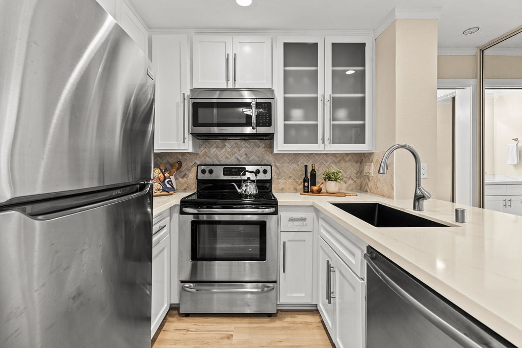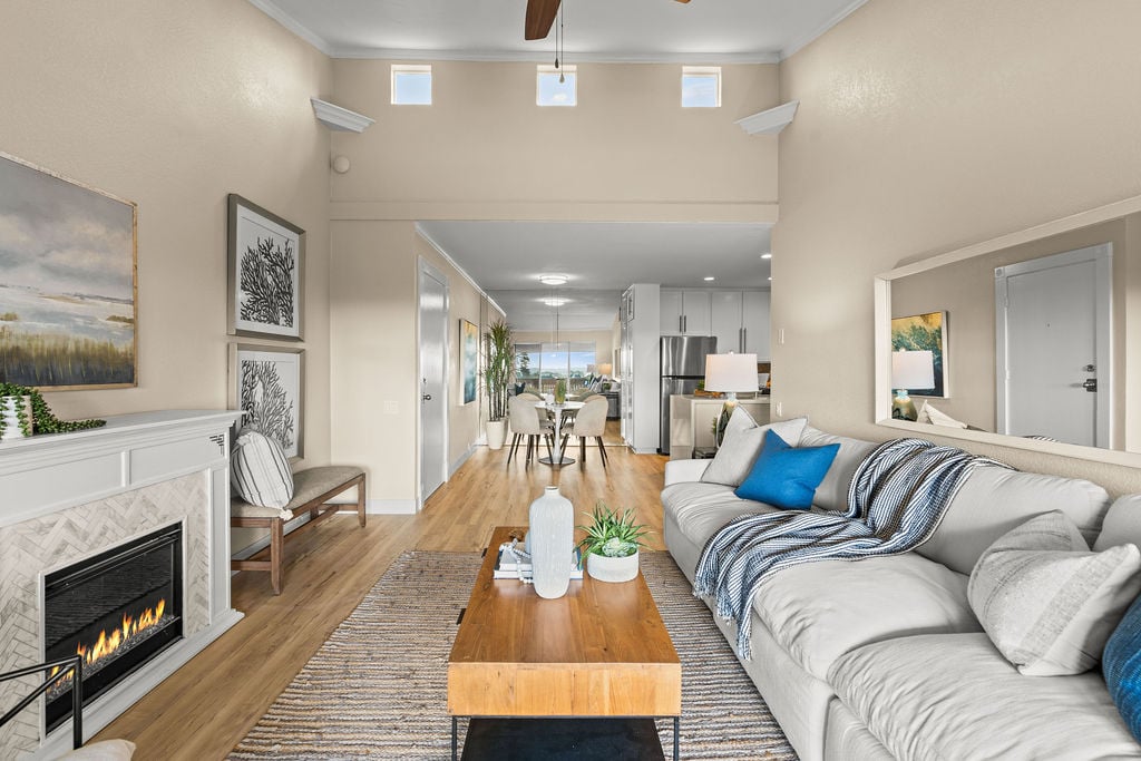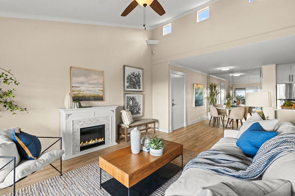 Live in the gem of PB, on Diamond St! Enjoy a true resort lifestyle at The Plaza. This top floor condo is located in one of Pacific Beach’s most sought-after communities and offers panoramic views of the Pacific Ocean, Mission Bay and Sea World fireworks! The sunny south facing layout brings in beautiful natural light, and the extra high ceilings create an open, spacious feel. The home has been tastefully updated with brand new vinyl flooring, Ceiling fans, fresh paint, a lovely kitchen featuring shaker style cabinetry, quartz counters with a waterfall edge, stainless steel appliances, stone backsplash tiles in a tasteful herringbone pattern and recessed lighting. The refreshed bathroom includes quartz countertops along with new fixtures and finishes for a clean, modern look. The bedroom is generously sized with two closets and includes plantation shutters and crown molding. The living room features a cozy electric fireplace, vaulted ceiling and access to a large balcony where you can take in the panoramic views and enjoy the ocean breezes. Unit comes with a dedicated covered parking space in the secured garage. The Plaza offers an impressive collection of amenities including 4 heated pools, hot tubs, a fitness center, tennis / pickleball courts, a billiards room, library, movie room, lounge spaces, BBQ areas, a tropical lagoon, and a 24-hour on-site security. The community is also FHA and VA approved. Living in Pacific Beach means having endless options close by, from casual beachside cafés to upscale dining, lively nightlife, local boutiques, surf shops, and convenient grocery stores like Vons and Trader Joe’s. Outdoor lovers will appreciate nearby parks and recreational areas such as Kate Sessions Park, known for its sweeping city and bay views. The area also hosts regular community events and local farmers markets, adding to its vibrant coastal charm.