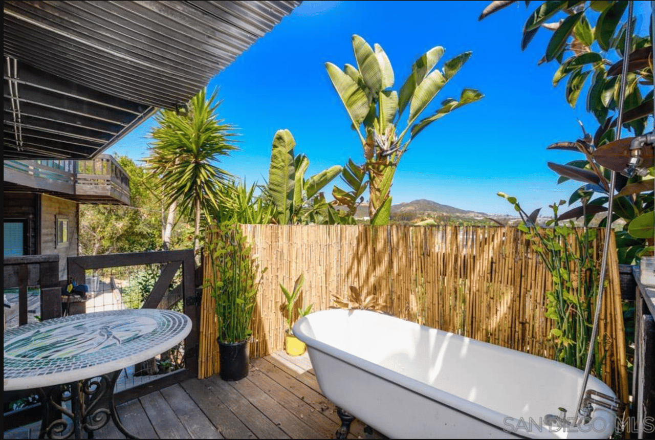 The primary suite offers a truly unique experience, with a private balcony showcasing a clawfoot tub and shower—perfect for relaxing under the sun or stars.