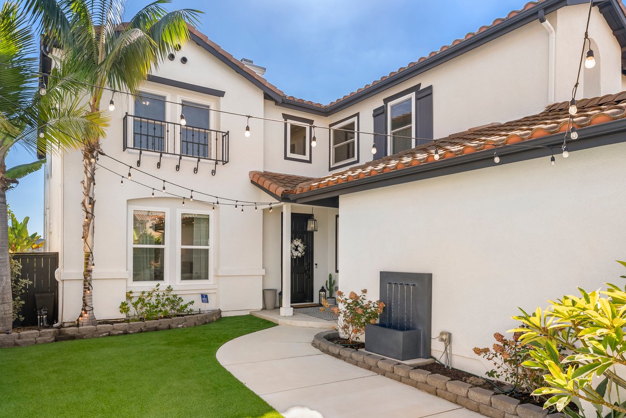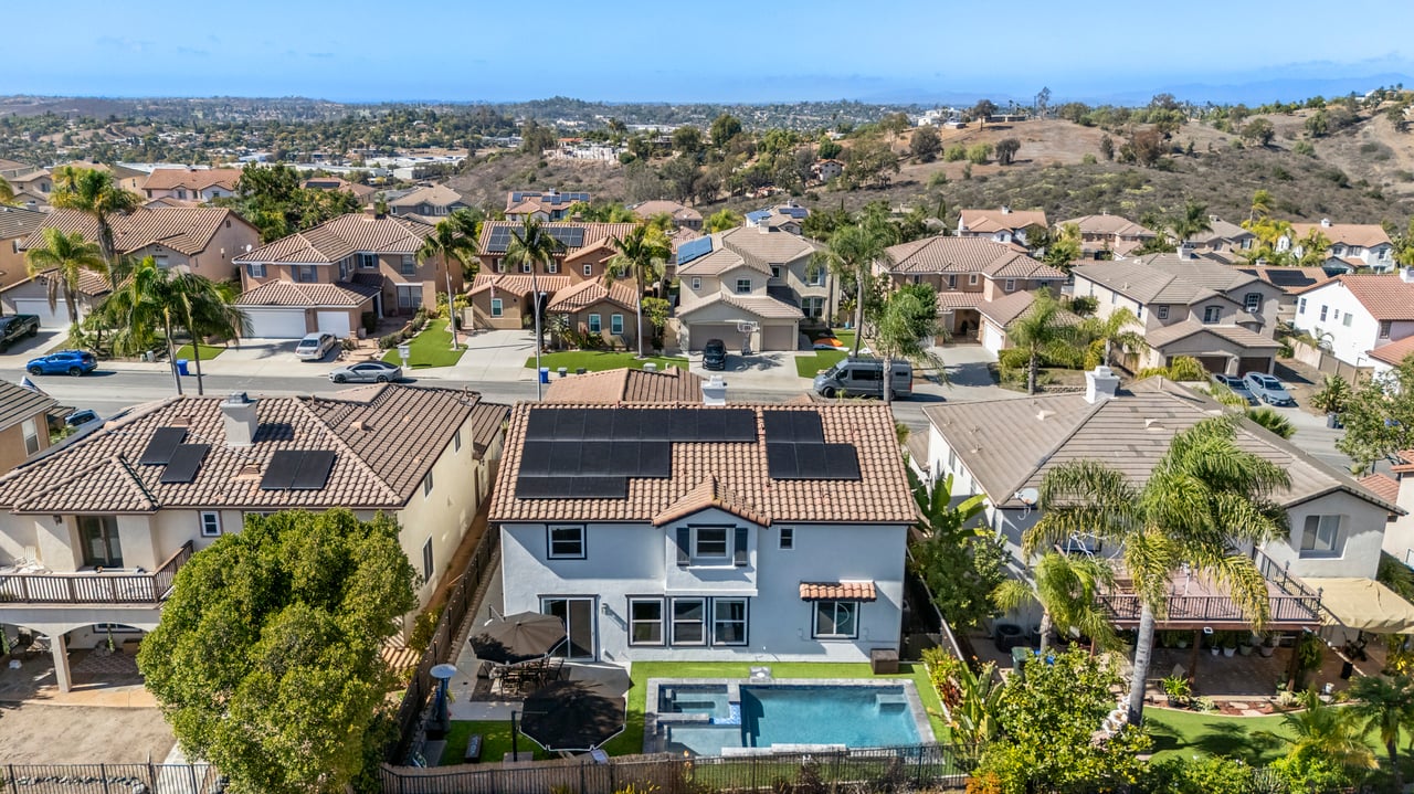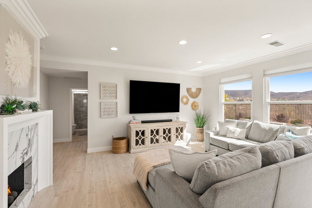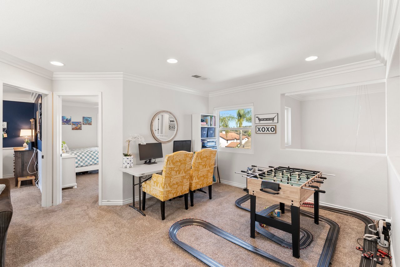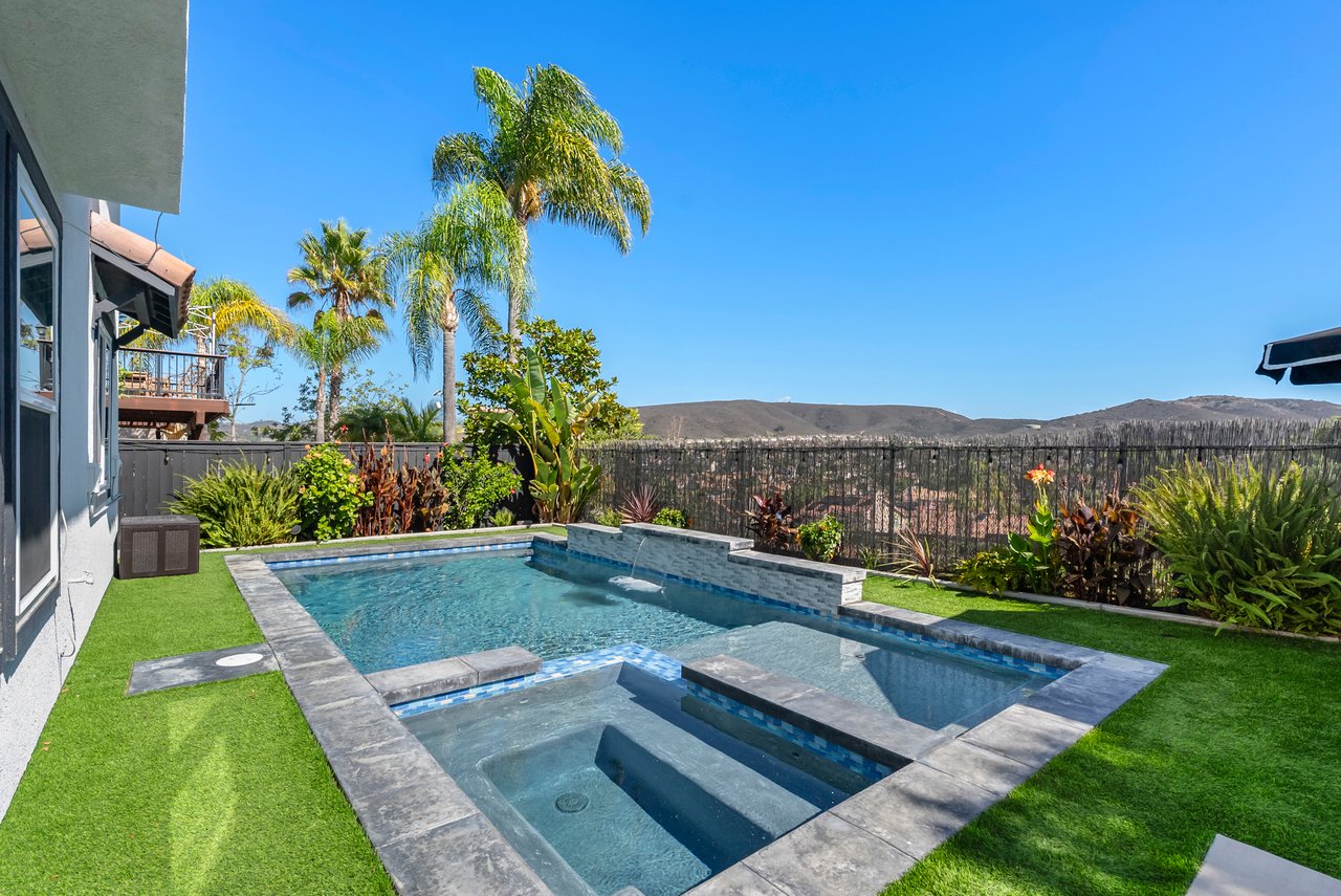INCREDIBLE Santa Fe Hills home in San Marcos! Step inside this stunning residence and prepare to be captivated. The heart of the home is a designer kitchen featuring a custom Brazilian stone waterfall island, soft-close shaker cabinetry with champagne bronze hardware, stainless steel appliances and a dual zone 220+ bottle wine fridge. Every detail has been thoughtfully curated from a designers eye. Some of our favorite details include the illuminated pantry, elegant chandeliers, crown molding, recessed lighting, porcelain tile flooring and custom wallpaper accents throughout. Enjoy the best of California living in your private backyard retreat complete with no rear neighbors, a sparkling pool and spa with a fountain feature, low-maintenance turf, and sweeping mountain views. OWNED SOLAR and upgraded dual pane vinyl windows keep energy costs low, while A/C, ceiling fans and fireplace keep the home at the perfect temperature year round. This home offers a flexible floor plan with a downstairs bedroom and full bath, laundry room with sink + folding area and a spacious loft area perfect for play or work. The primary suite is a true sanctuary, boasting vaulted ceilings, two large walk-in closets with custom built in organizers, dual sinks, and a spa-like bathroom with shower and separate soaking tub. Ideally located with direct access to walking trails and moments from multiple neighborhood parks and the highly coveted and top-rated Paloma Elementary School. Las Posas Park with its pool, tennis courts, and sports fields is just down the street. Commuters will love the easy 78 freeway access or a quick ride on the Sprinter, while shoppers and foodies will appreciate the proximity to an abundance of stores and dining options. Palomar College is less than 5 minutes away. Mello Roos fee expires Sept 2027 and NO HOA! This home truly has it all. Homes like this are a rare find in Santa Fe Hills. Don’t wait on this one!