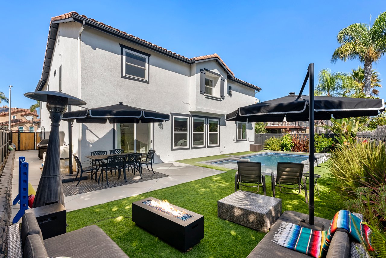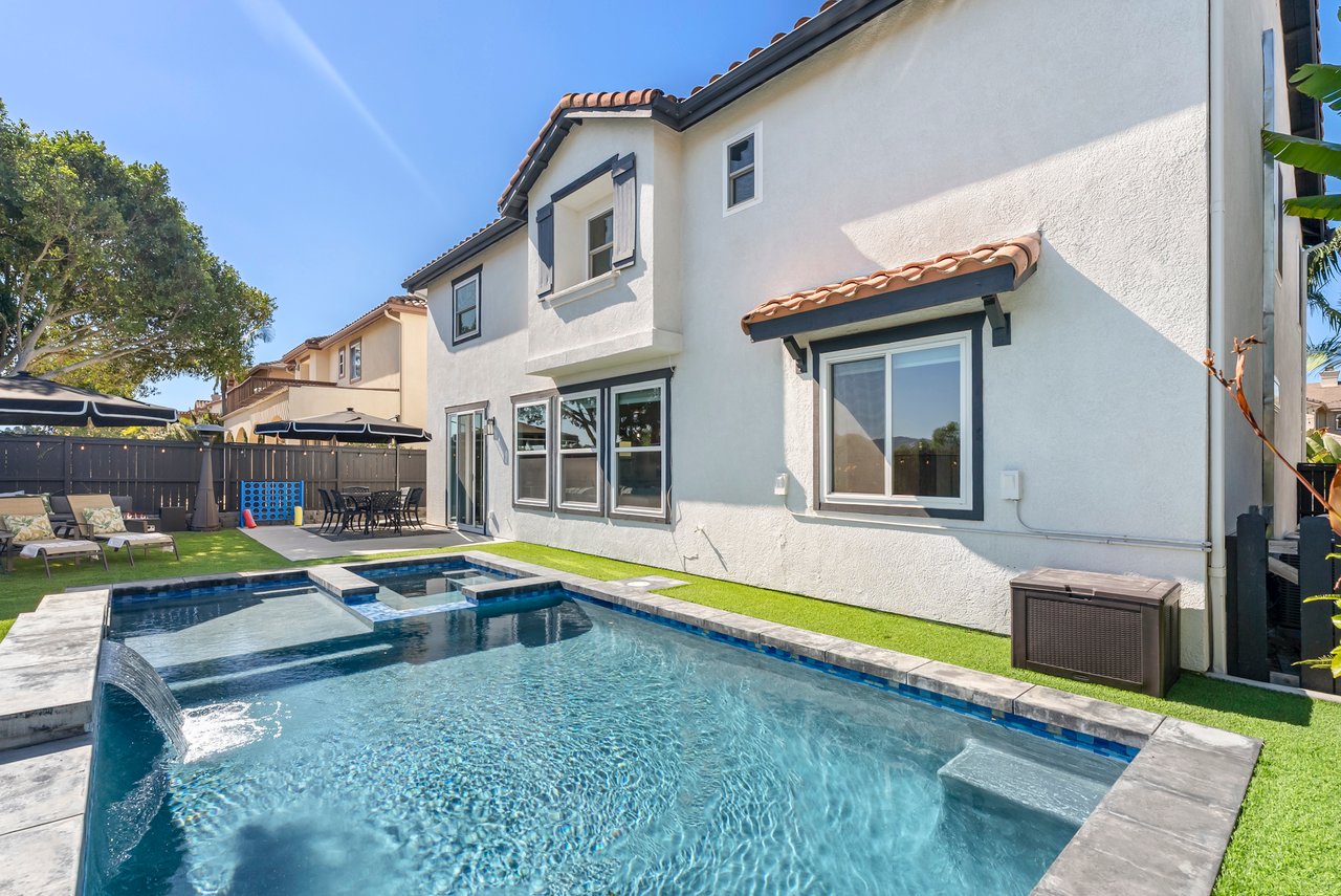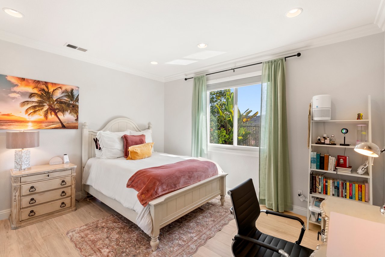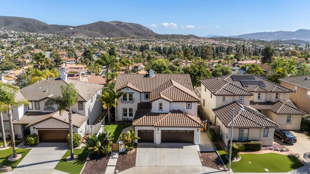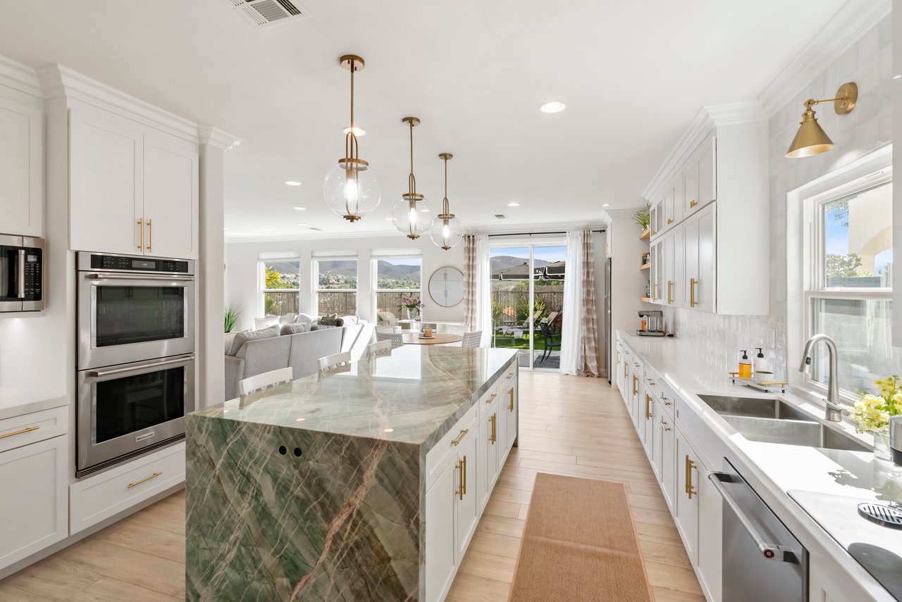 INCREDIBLE Santa Fe Hills home in San Marcos! Step inside this stunning residence and prepare to be captivated. The heart of the home is a designer kitchen featuring a custom Brazilian stone waterfall island, soft-close shaker cabinetry with champagne bronze hardware, stainless steel appliances and a dual zone 220+ bottle wine fridge. Every detail has been thoughtfully curated from a designers eye. Some of our favorite details include the illuminated pantry, elegant chandeliers, crown molding, recessed lighting, porcelain tile flooring and custom wallpaper accents throughout. Enjoy the best of California living in your private backyard retreat complete with no rear neighbors, a sparkling pool and spa with a fountain feature, low-maintenance turf, and sweeping mountain views. OWNED SOLAR and upgraded dual pane vinyl windows keep energy costs low, while A/C, ceiling fans and fireplace keep the home at the perfect temperature year round. This home offers a flexible floor plan with a downstairs bedroom and full bath, laundry room with sink + folding area and a spacious loft area perfect for play or work. The primary suite is a true sanctuary, boasting vaulted ceilings, two large walk-in closets with custom built in organizers, dual sinks, and a spa-like bathroom with shower and separate soaking tub. Ideally located with direct access to walking trails and moments from multiple neighborhood parks and the highly coveted and top-rated Paloma Elementary School. Las Posas Park with its pool, tennis courts, and sports fields is just down the street. Commuters will love the easy 78 freeway access or a quick ride on the Sprinter, while shoppers and foodies will appreciate the proximity to an abundance of stores and dining options. Palomar College is less than 5 minutes away. Mello Roos fee expires Sept 2027 and NO HOA! This home truly has it all. Homes like this are a rare find in Santa Fe Hills. Don’t wait on this one!