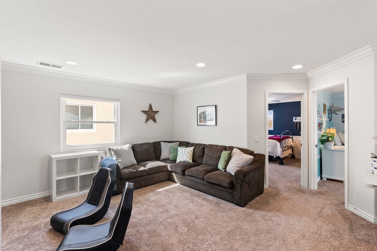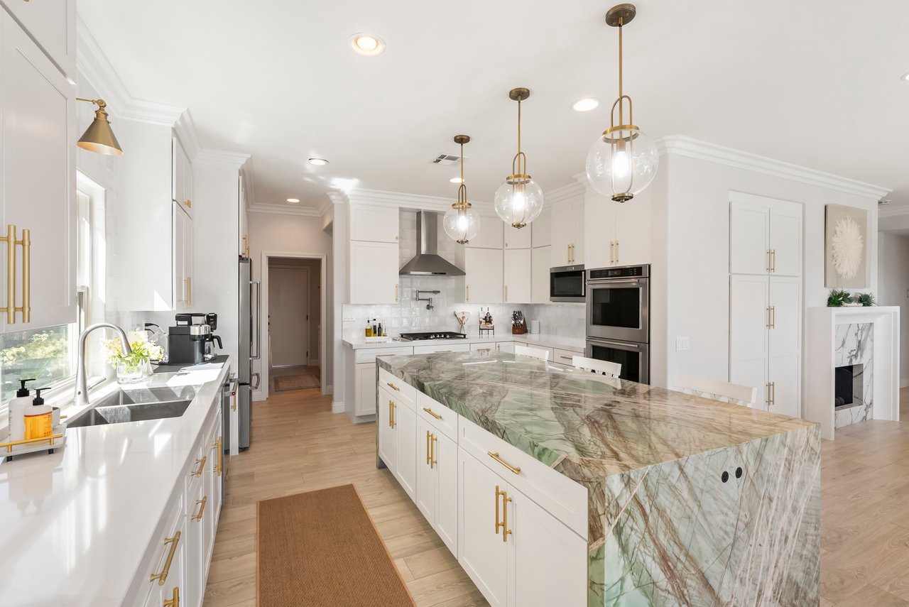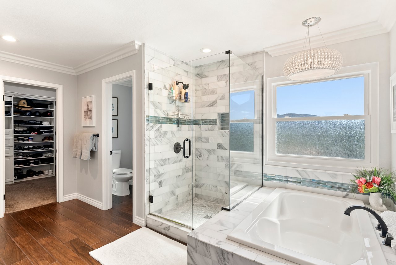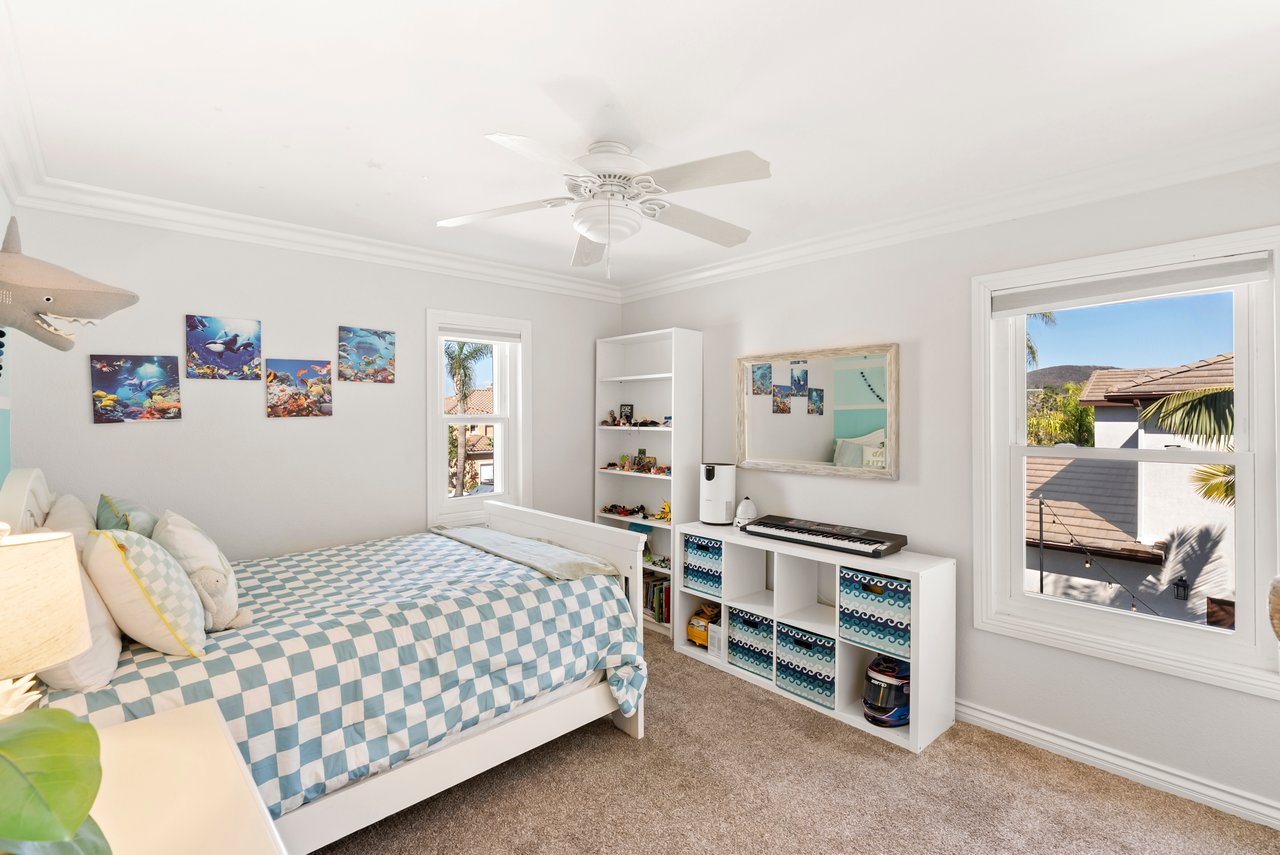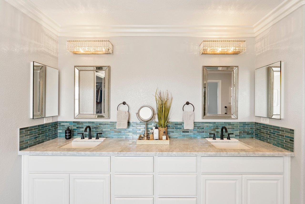 INCREDIBLE Santa Fe Hills home in San Marcos! Step inside this stunning residence and prepare to be captivated. The heart of the home is a designer kitchen featuring a custom Brazilian stone waterfall island, soft-close shaker cabinetry with champagne bronze hardware, stainless steel appliances and a dual zone 220+ bottle wine fridge. Every detail has been thoughtfully curated from a designers eye. Some of our favorite details include the illuminated pantry, elegant chandeliers, crown molding, recessed lighting, porcelain tile flooring and custom wallpaper accents throughout. Enjoy the best of California living in your private backyard retreat complete with no rear neighbors, a sparkling pool and spa with a fountain feature, low-maintenance turf, and sweeping mountain views. OWNED SOLAR and upgraded dual pane vinyl windows keep energy costs low, while A/C, ceiling fans and fireplace keep the home at the perfect temperature year round. This home offers a flexible floor plan with a downstairs bedroom and full bath, laundry room with sink + folding area and a spacious loft area perfect for play or work. The primary suite is a true sanctuary, boasting vaulted ceilings, two large walk-in closets with custom built in organizers, dual sinks, and a spa-like bathroom with shower and separate soaking tub. Ideally located with direct access to walking trails and moments from multiple neighborhood parks and the highly coveted and top-rated Paloma Elementary School. Las Posas Park with its pool, tennis courts, and sports fields is just down the street. Commuters will love the easy 78 freeway access or a quick ride on the Sprinter, while shoppers and foodies will appreciate the proximity to an abundance of stores and dining options. Palomar College is less than 5 minutes away. Mello Roos fee expires Sept 2027 and NO HOA! This home truly has it all. Homes like this are a rare find in Santa Fe Hills. Don’t wait on this one!